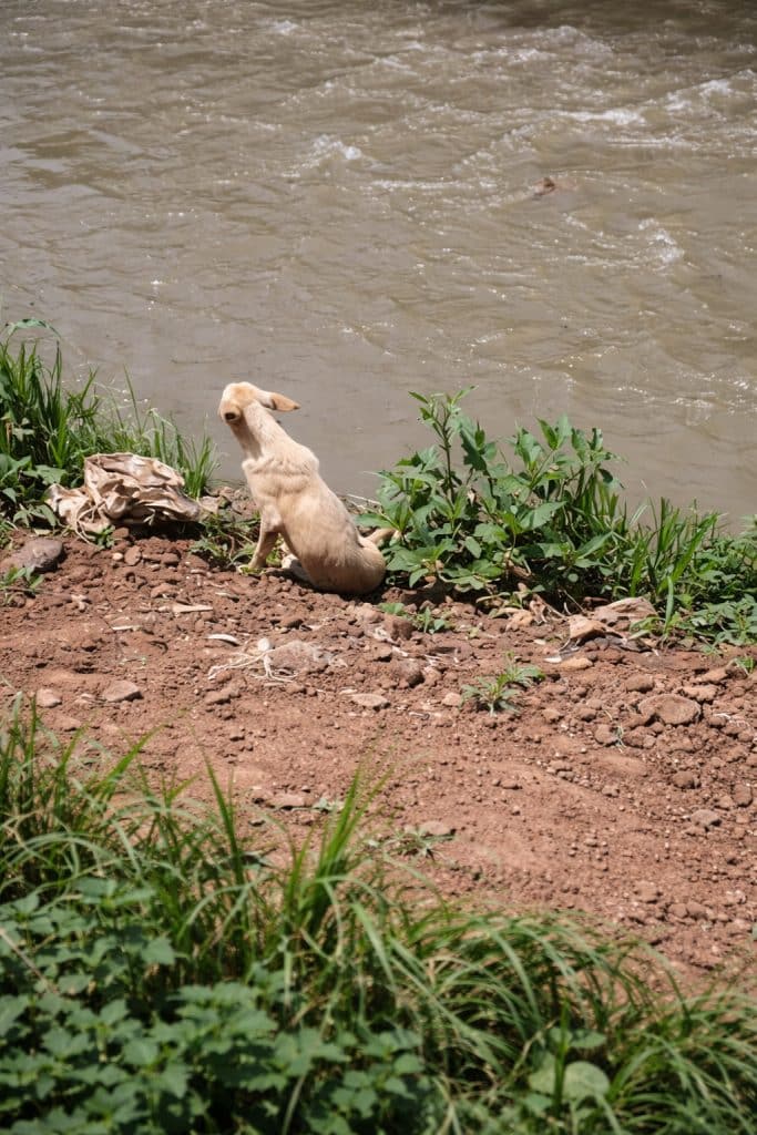 By the edge of a steep, muddy ditch, a small dog sat completely still.