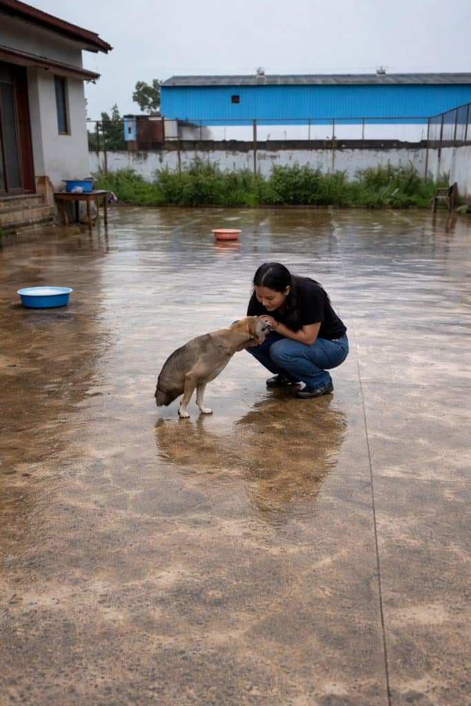 A small dog stood on the wet ground after the rain—steady, balanced… but different.