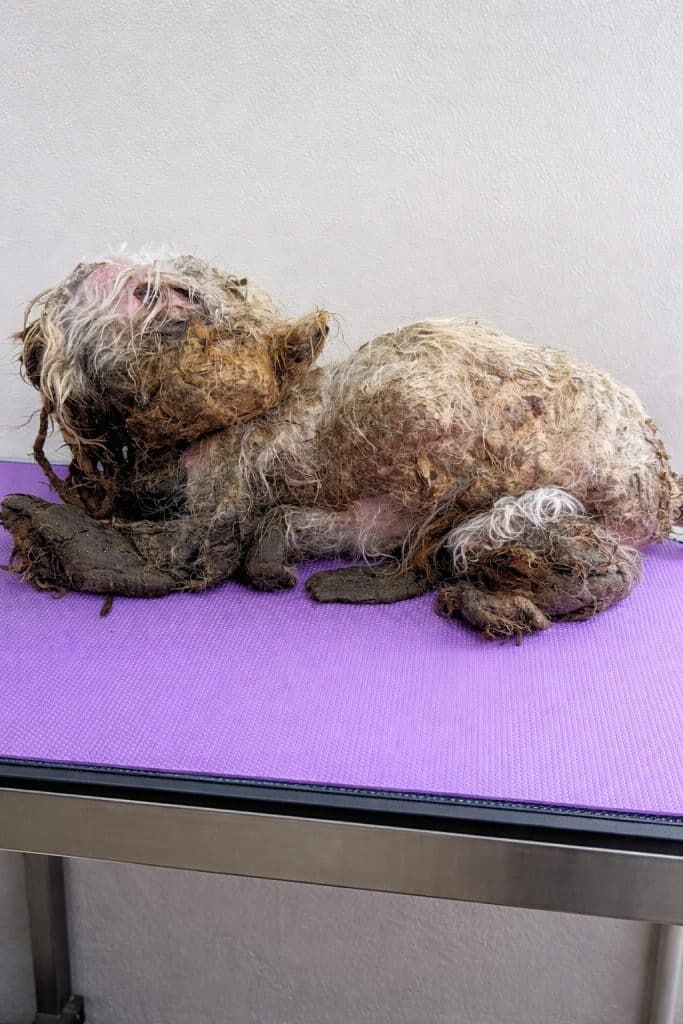 Two small shapes on the street—covered in thick, hardened layers of dirt, debris, and tangled fur.