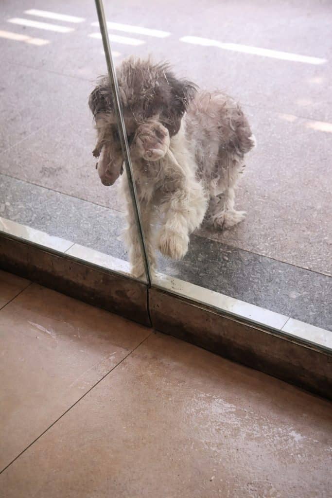 A stray dog—thin, unkempt, cautious…