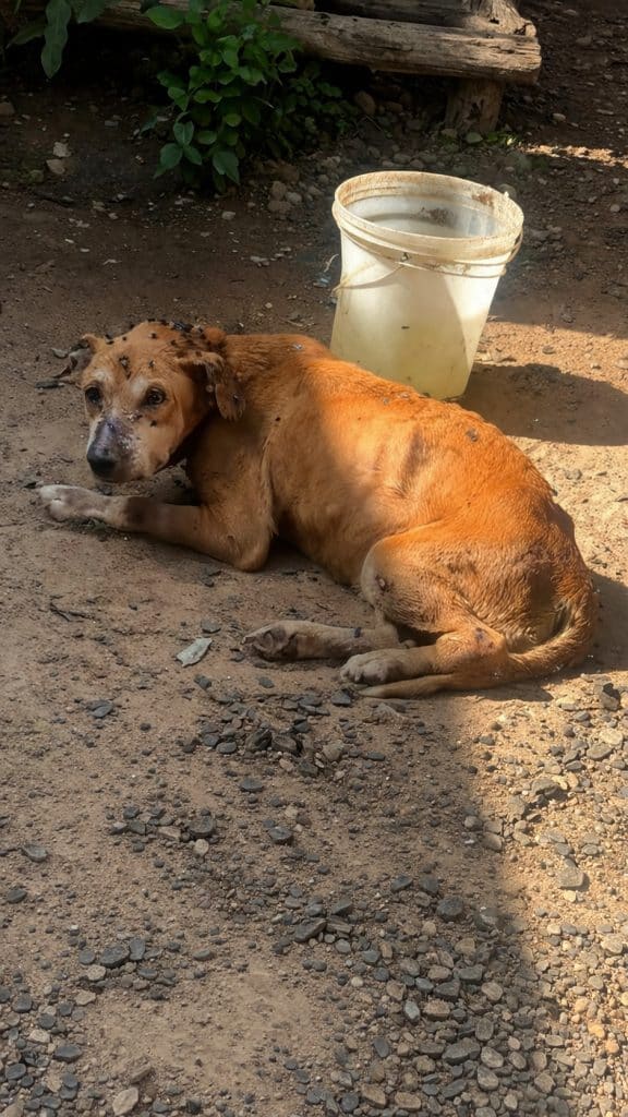 She lay motionless on the ground, her frail body barely more than skin and bone. An old chain kept her in place, as if even in that condition, she was still expected to stay where she had been left. Flies circled around her, drawn to wounds that had gone untreated for far too long.