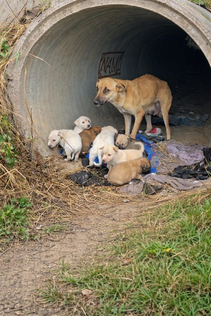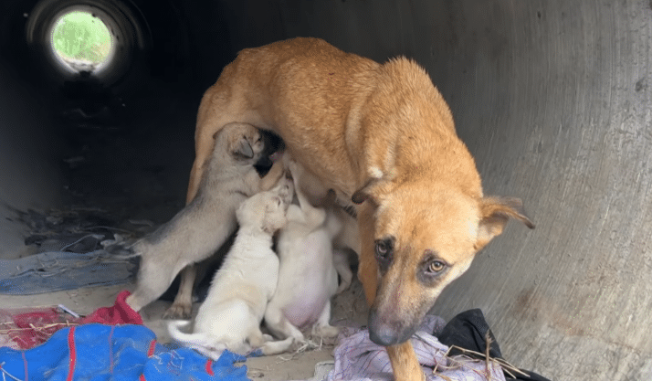 Hidden nearby, inside a large concrete pipe, their mother lay curled up.