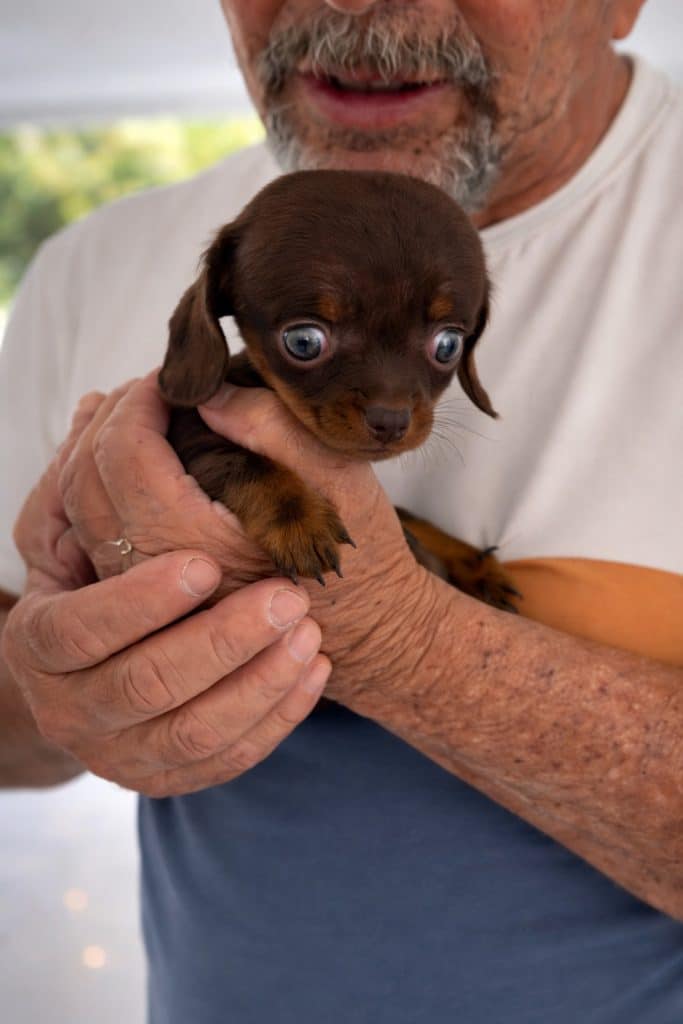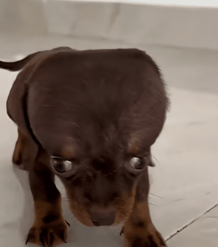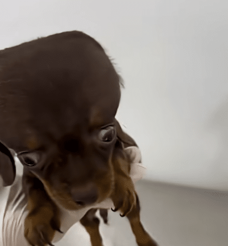 A tiny chocolate-colored Dachshund, barely beginning his life—but already carrying something far heavier than he should.