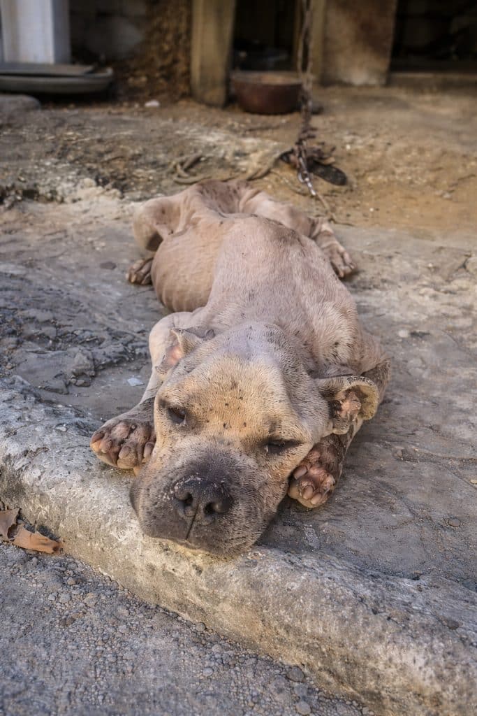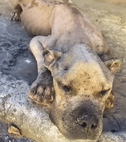 He lay stretched across a patch of dry concrete, so still that he almost blended into the silence around him. His body was painfully thin, each rib visible beneath his fragile skin. Dust clung to his fur, and faint marks along his body told a quiet story of time spent without care.