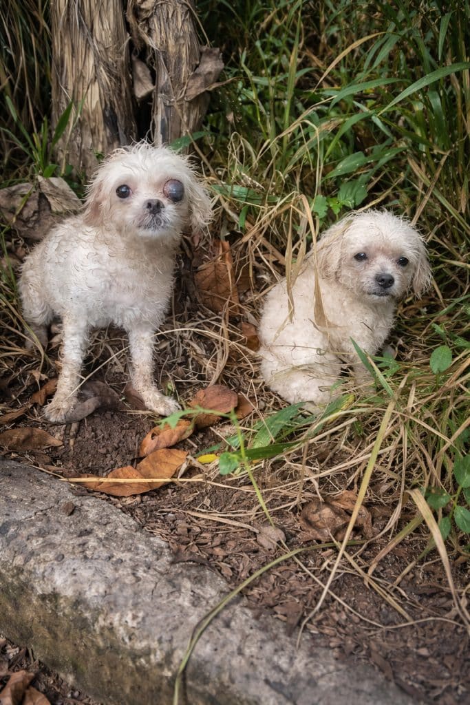 Two fragile dogs, once hidden in the weeds, are no longer invisible.