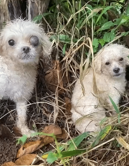 Curled close together in the brush, the tiny white dogs barely moved. Their once-soft fur was tangled and dirty, carrying the marks of days—or perhaps longer—spent without care. They didn’t bark. They didn’t call out.