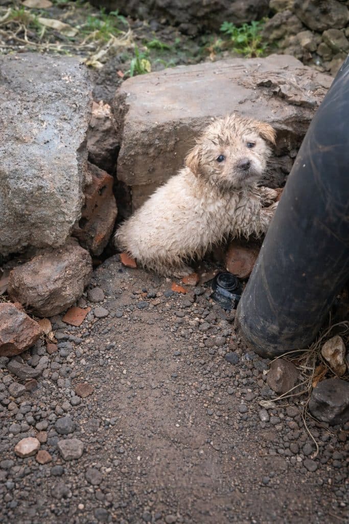 Tucked beside a quiet streetlight, a tiny puppy stood trembling, his small body soaked through and covered in mud. The world around him moved on as usual—cars passing, people heading home—but he stayed there, frozen in fear.