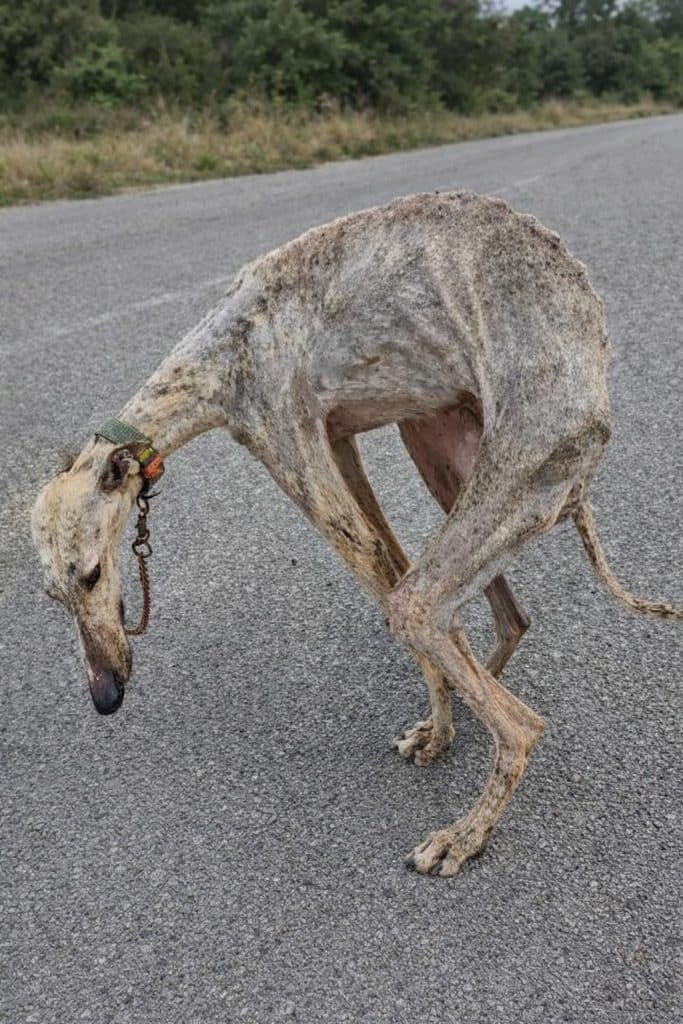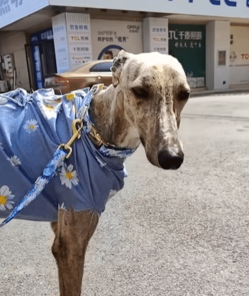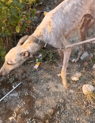 At the front of an old house, beneath years of quiet neglect, a thin greyhound stood tethered to a rusted chain. The space around him was small—too small for a life that had stretched across an entire decade.