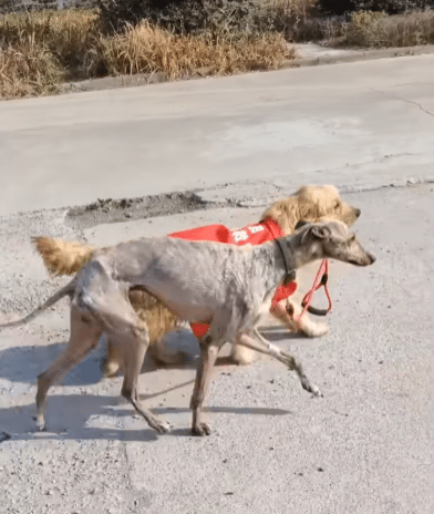 By his side was a gentle companion—a Golden Retriever who seemed to understand exactly what Kalou needed. With quiet patience, the other dog guided him forward, step by step, sometimes even holding the leash as if to say, you don’t have to do this alone.