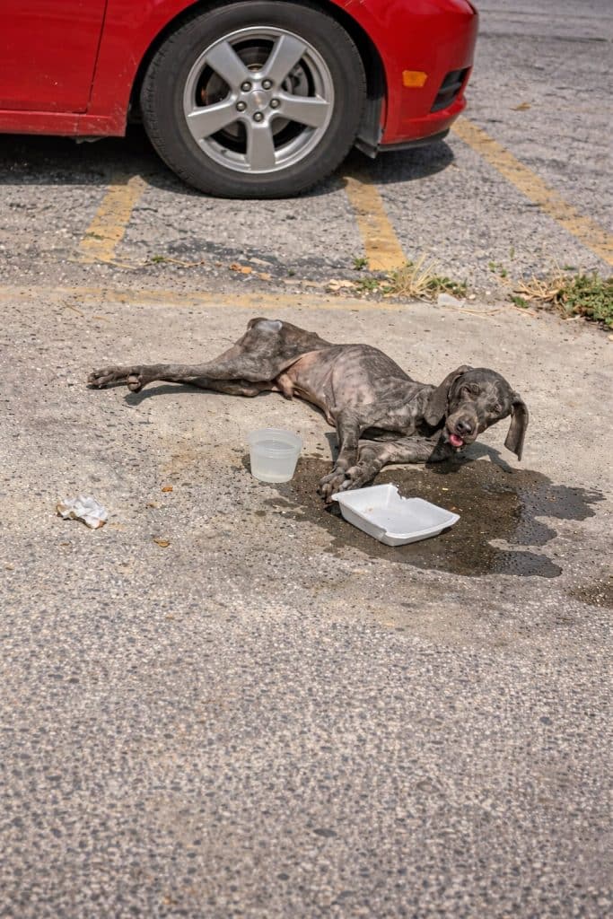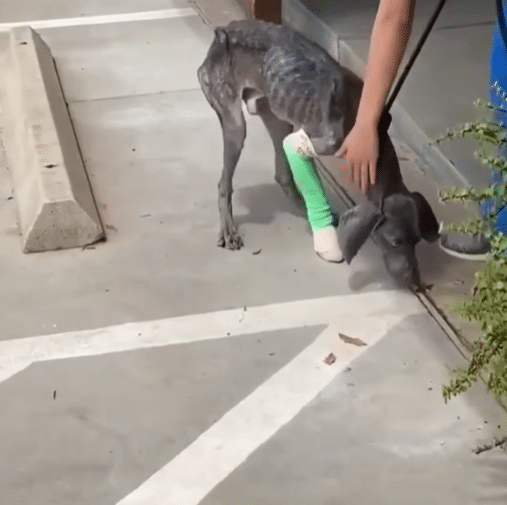 Opie lay quietly at the edge of the road, his body painfully thin, his breathing shallow and uneven. One of his front legs was badly injured, twisted in a way that made even the smallest movement unbearable.