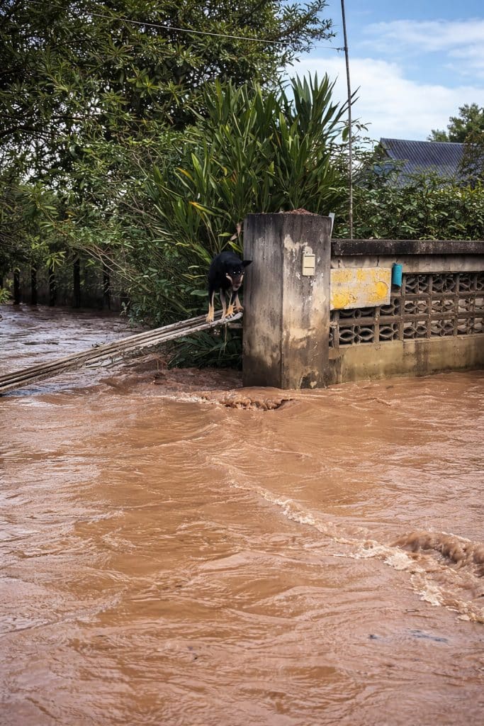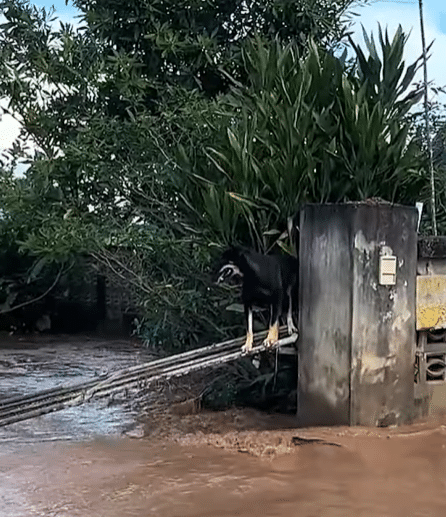 He had climbed onto a narrow set of metal bars leaning against a wall, just high enough to keep him above the flood. But there was nowhere else to go. Beneath him, the water surged with force. Around him, there was no solid ground—only movement, noise, and danger.