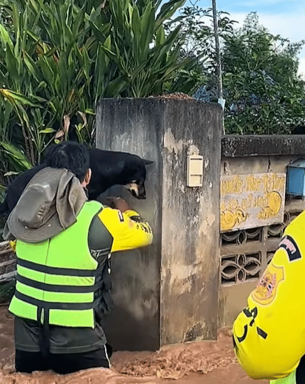 The rescuer reached out gently, lifting the dog with steady hands. The current pressed against his body as he turned, holding the fragile life close while walking through water that rose to his waist.