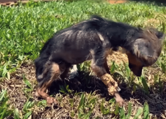 A small, fragile dog lay on the grass, her body so thin it seemed almost weightless. Her fur was rough and uneven, her limbs trembling with every attempt to stand. And each time she tried, she fell again.