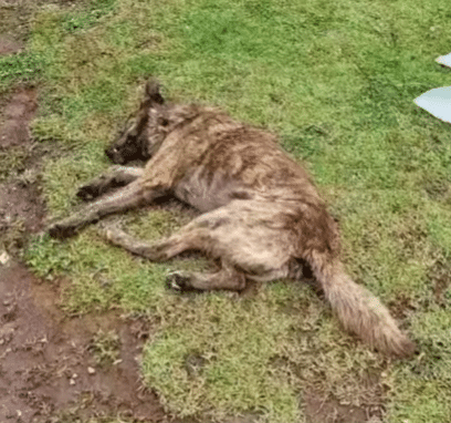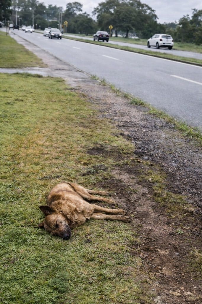 On the side of a busy road, a dog lay motionless—his body barely visible beneath the dim glow of passing headlights.