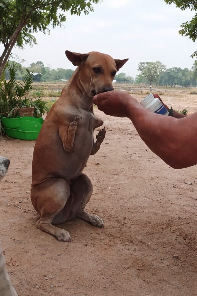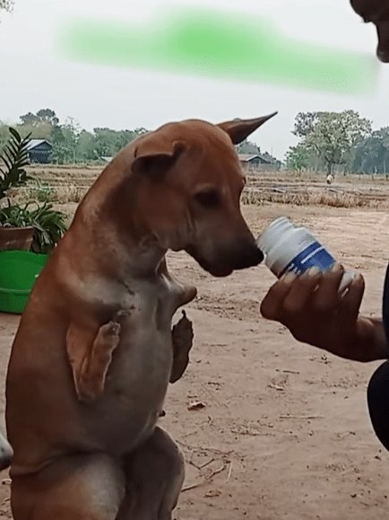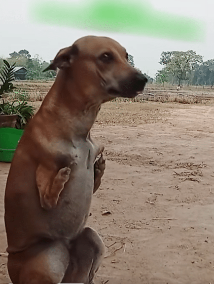 Instead of standing on all fours, he balances upright on his back legs—steady, practiced, almost natural. His front legs are short, shaped differently, suggesting a physical condition that has always set him apart.