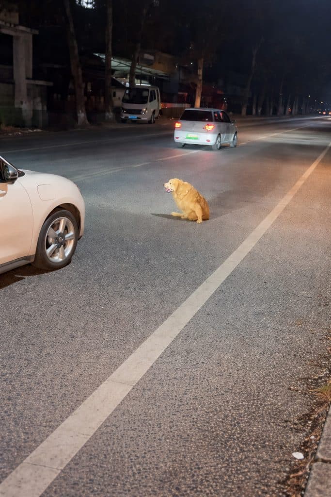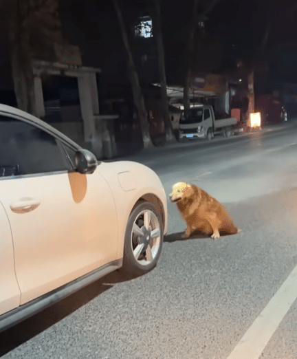 Right in the middle of an active road, under dim streetlights and passing traffic, a Golden Retriever struggled to move.