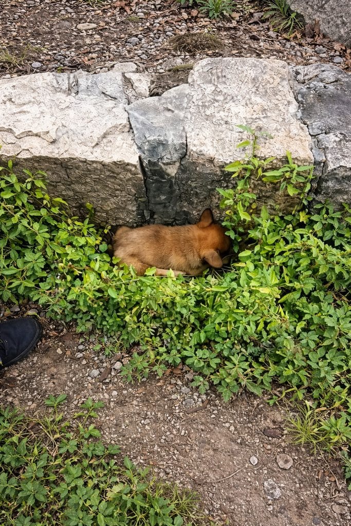 Tucked deep inside a roadside bush, a tiny brown puppy lay frozen in fear.