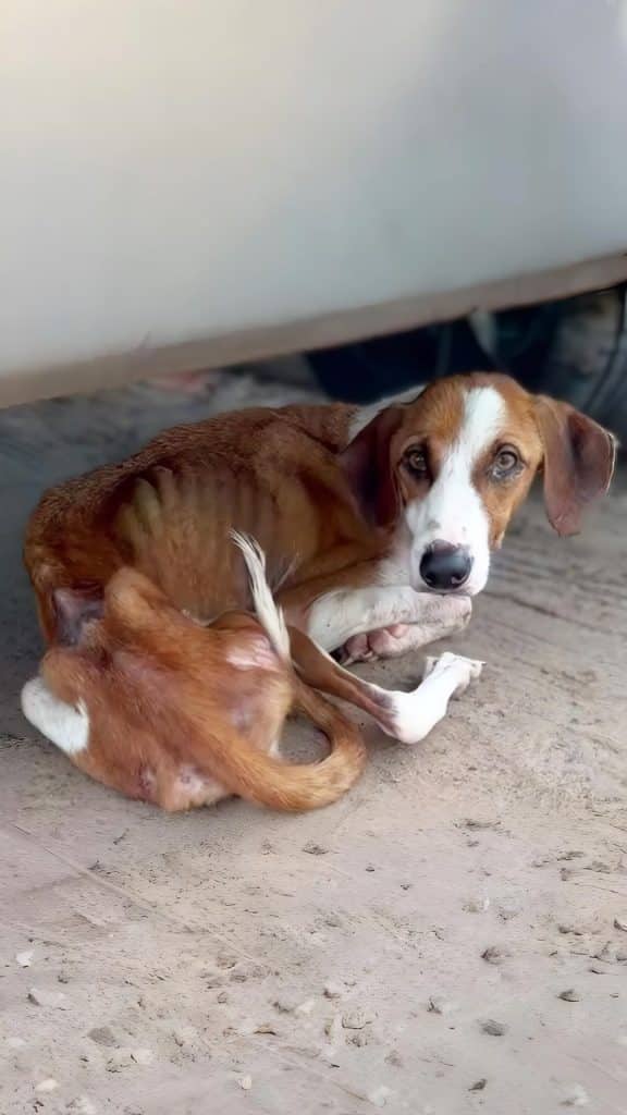 At first, she was easy to miss. Curled low, blending into the shadows, she watched the world pass by with tired eyes. While shoppers hurried past, focused on lists and schedules, no one seemed to notice the dog hiding just inches from their feet. Her body was thin, her posture guarded, and her gaze carried a depth that hinted at long days of hunger, fear, and solitude.
