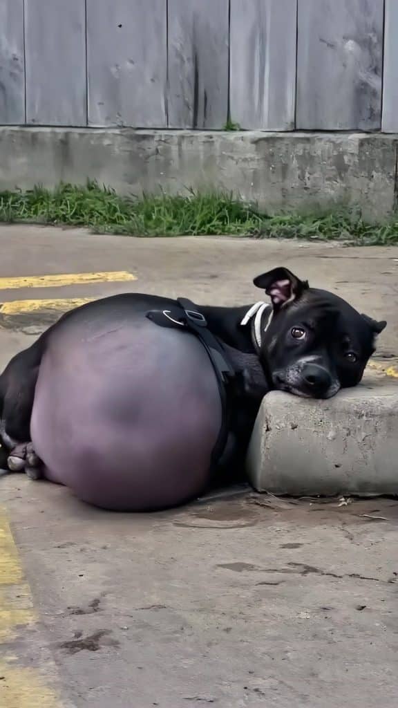 Lying in the dust was a small black dog, barely able to lift her head.