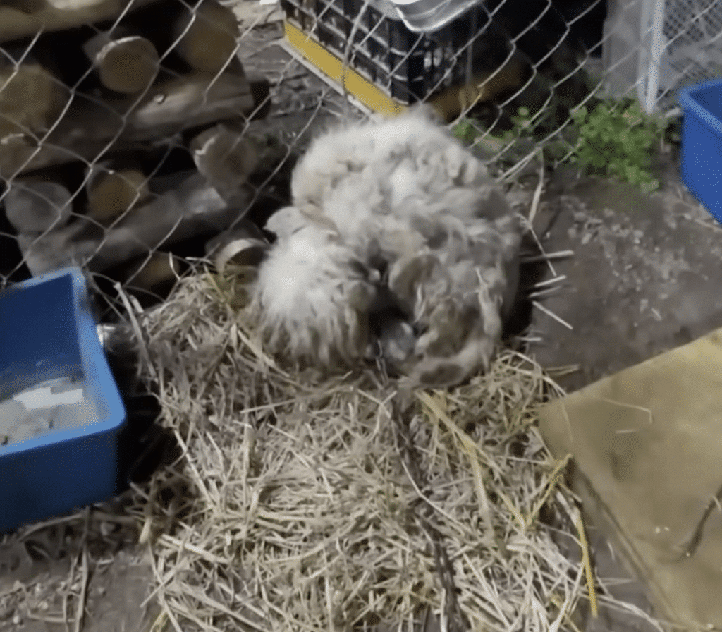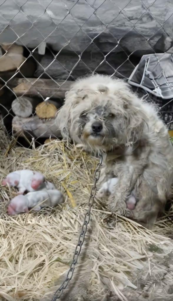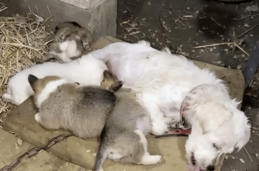 A thin mother dog, chained to an old post, curled tightly around her newborn puppies.