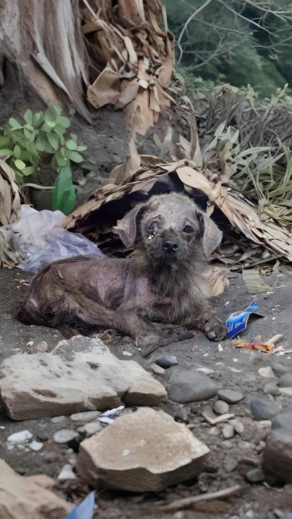 In a forgotten corner of an abandoned hut, a tiny dog lay curled into the dirt.
