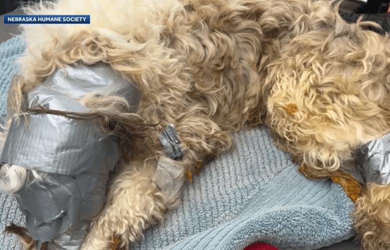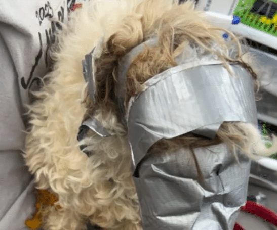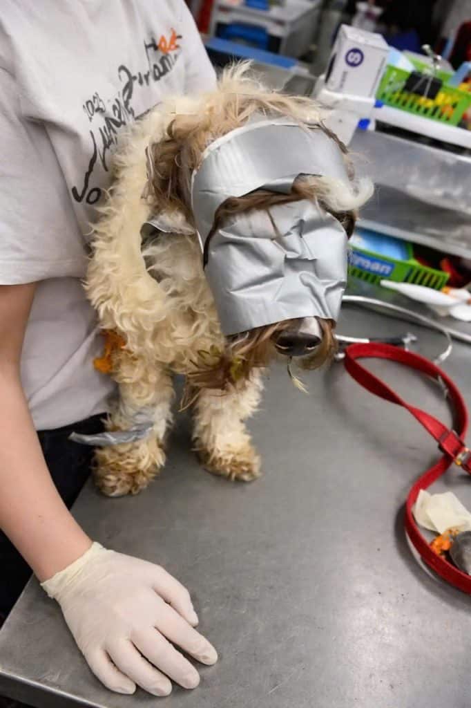 A small dog—completely restrained.