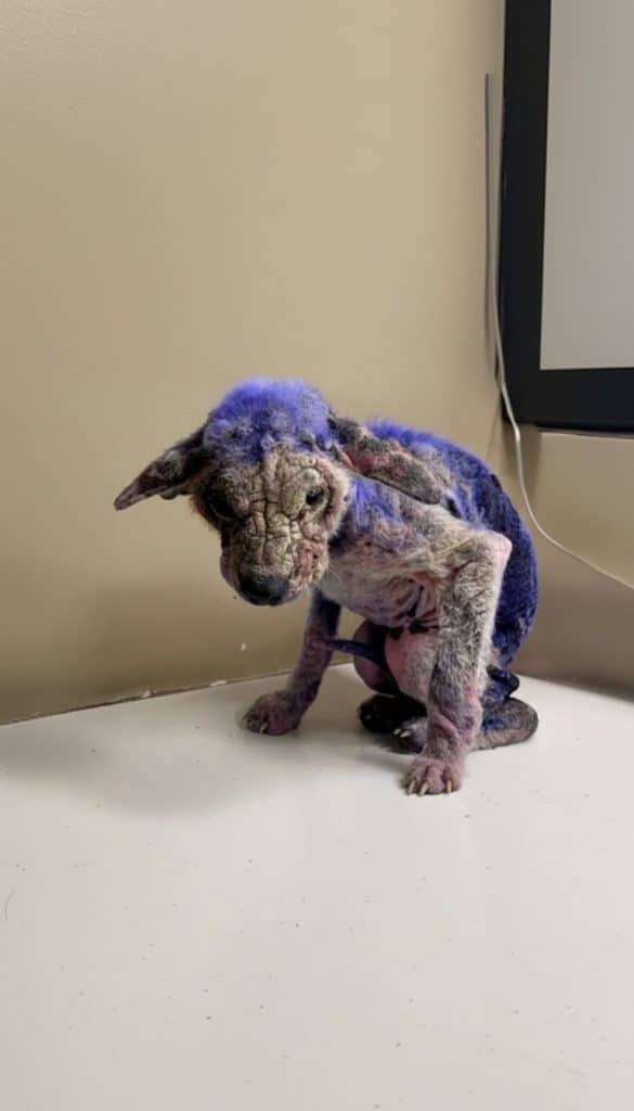 As the medical team worked, the truth slowly came into focus. The purple coloring covering much of her body wasn’t bruising or dye—it was the result of a powerful antiseptic. Someone, likely trying to help but tragically misinformed, had treated her severe mange with a product meant for cows and other large farm animals. While the intention may not have been cruel, the outcome was devastating. The solution was far too harsh for a small dog, stripping away her fur and irritating her already sensitive skin.