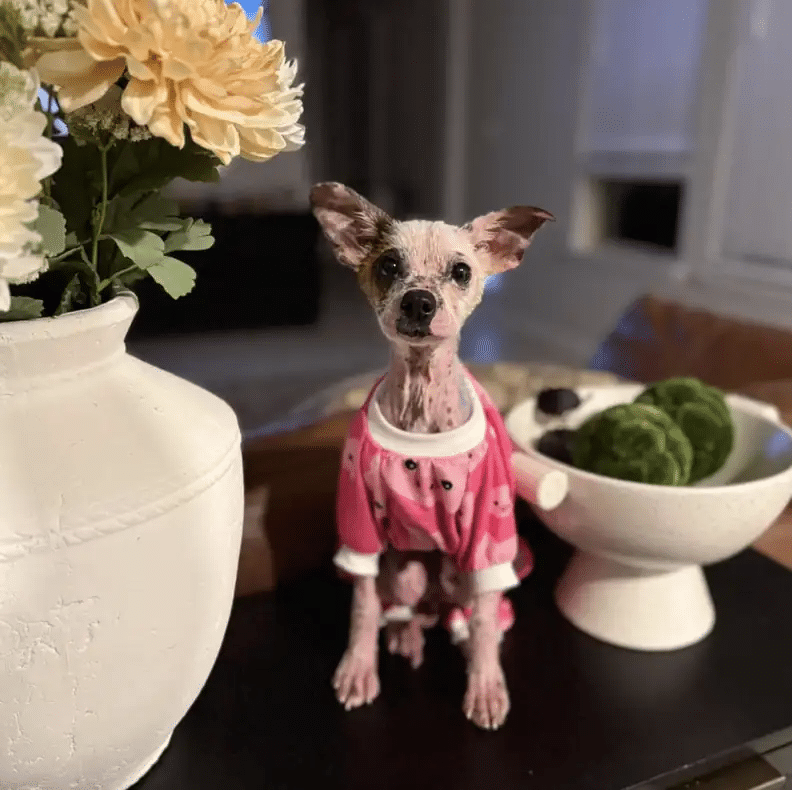 Because Violet still lacked most of her fur, staying warm was important. Bri dressed her in soft little outfits, not for style, but for comfort. The clothes helped her maintain body heat and gave her an extra sense of security. Slowly, Violet’s personality began to shine through. She relaxed, started to wag her tail more often, and showed clear signs of happiness.