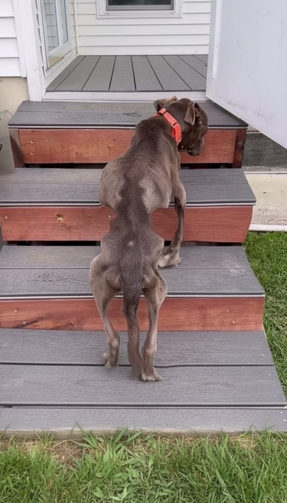 Rosie took a few hesitant steps forward, then stopped. It was clear she was fighting her own body just to remain standing. Hunger and exhaustion had drained her strength, and fear had drained her spirit. She had wandered until there was nothing left to give. Reaching that door wasn’t chance—it was courage born from desperation.