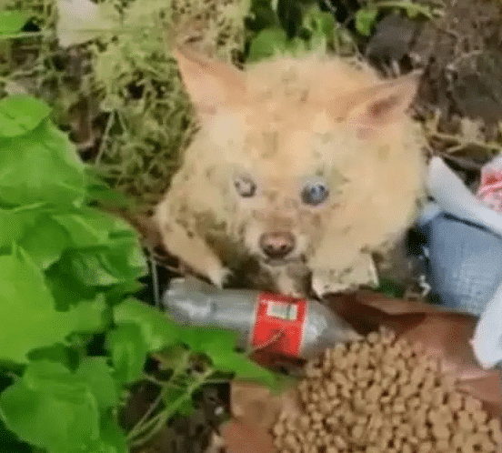 Curiosity got the better of them. The rescue team followed the dog as she led them away from the main path, through brush and over uneven ground. The journey ended at a shallow ditch, where something heartbreaking lay. A small, motionless dog—her eyes clouded and one larger than the other—was curled up against the dirt.