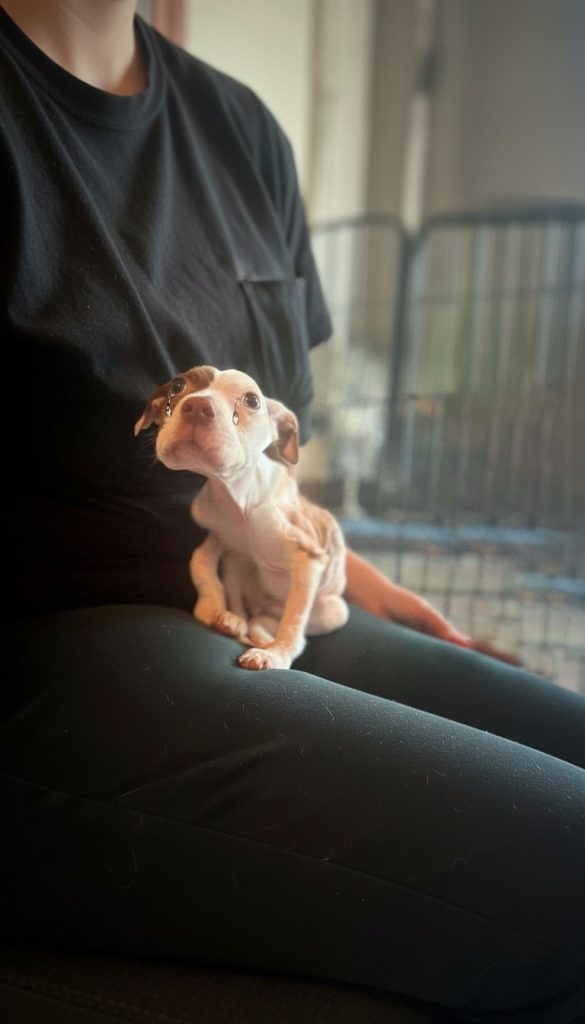 The road ahead was daunting, but Tink wasn’t facing it alone. Her foster mother stepped in with unwavering commitment, reshaping her daily life around this tiny puppy’s needs. After a complex surgery to correct the defect, recovery required extraordinary patience. Tink could no longer eat like a normal puppy. Instead, she was fed carefully measured micro-meals several times a day. Each feeding was followed by an unusual but necessary routine—being held upright for an extended period so gravity could safely guide the food down.