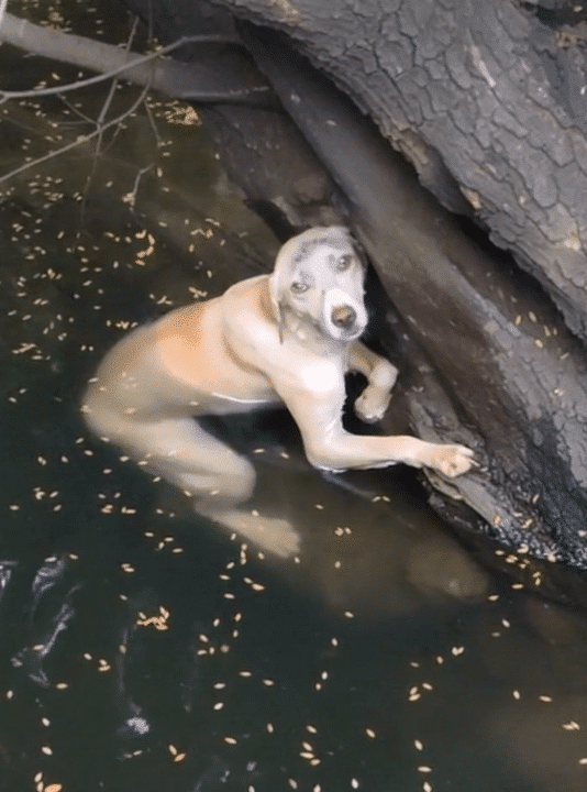 For an unknown length of time, the dog remained in the well. The depth and smooth walls made escape impossible. With every attempt to climb, she slid back down, scraping her paws against the hard surface. By the time help arrived, she was visibly exhausted. Her body trembled with fatigue, and her strength was nearly gone. She clung desperately to the side of the well, holding on with everything she had left.