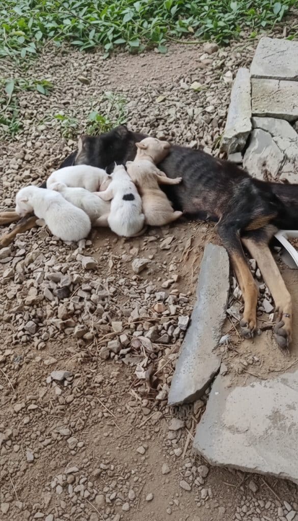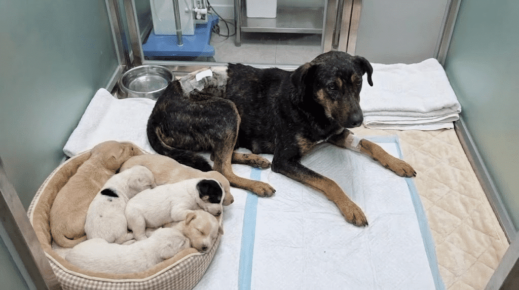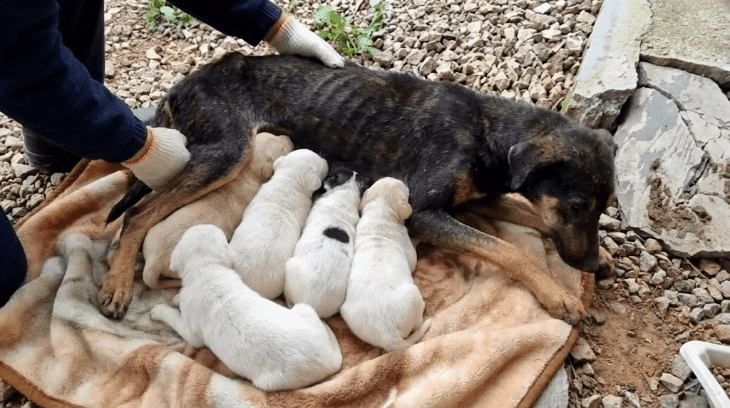 For days, Sakura remained motionless by the rocks, nursing her puppies with a strength that defied the exhaustion wracking her body. Her back had been shattered by a passing car, but she refused to abandon her little ones. Even when she could barely move, her unbreakable maternal instinct guided her every action.