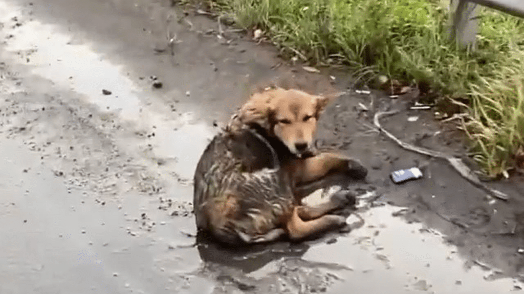 At first glance, it looked like just another shadow leftover from the storm. But as they approached, they realized it was a dog — soaked, shivering, and trying desperately to stay awake. No one knew how long he had been lying there or how long he had been hoping someone might stop. But that morning, his silent plea for help was finally heard.