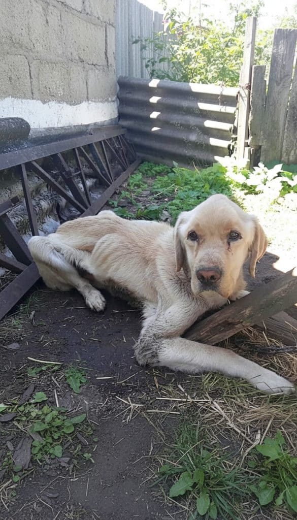 Boss, a Labrador, was barely hanging on. His body was dangerously thin, weakened by weeks of hunger and stress. He was frightened, confused, and unsure of the people standing before him. After everything he had endured, trust felt like a distant memory.