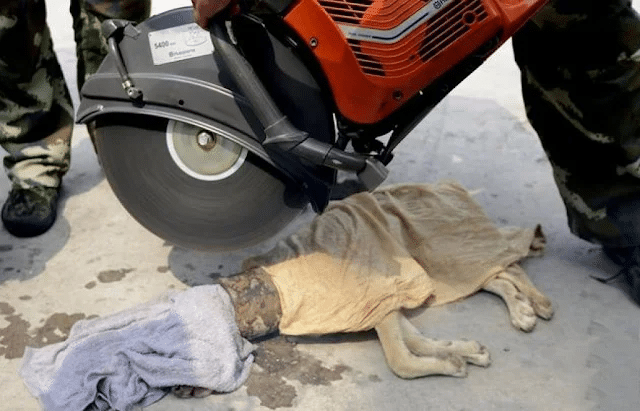 In a quiet neighborhood, a troubling scene unfolded when local rescue teams were called to help a dog in visible distress. The animal had been struggling for some time with a collar that had become painfully tight, cutting into its neck and restricting movement. At first, rescuers tried standard methods to remove it, but the material proved stubborn and unyielding. Only after bringing in specialized tools were they finally able to free the dog and prevent further injury.
