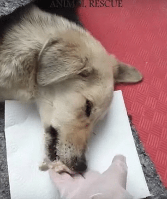 That’s when the dog was found lying on the ground, barely able to move. He was weak, exhausted, and clearly in pain. His breathing was labored, and he had gone without food for far too long. It was immediately clear that he needed urgent help.