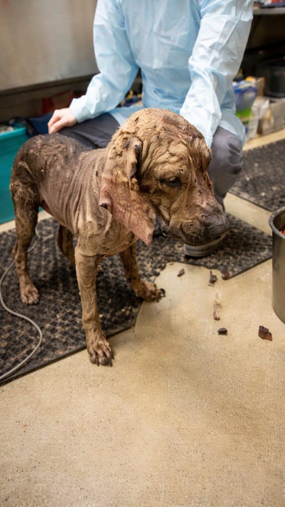 The rescue team acted quickly, focusing first on stabilizing the dog. Pain relief, wound cleaning, and warmth became immediate priorities. A veterinary examination confirmed the seriousness of the situation: advanced skin disease, infection, and extreme weakness caused by prolonged neglect. Recovery would not be fast. It would demand daily care, close observation, and patience measured in weeks rather than days.