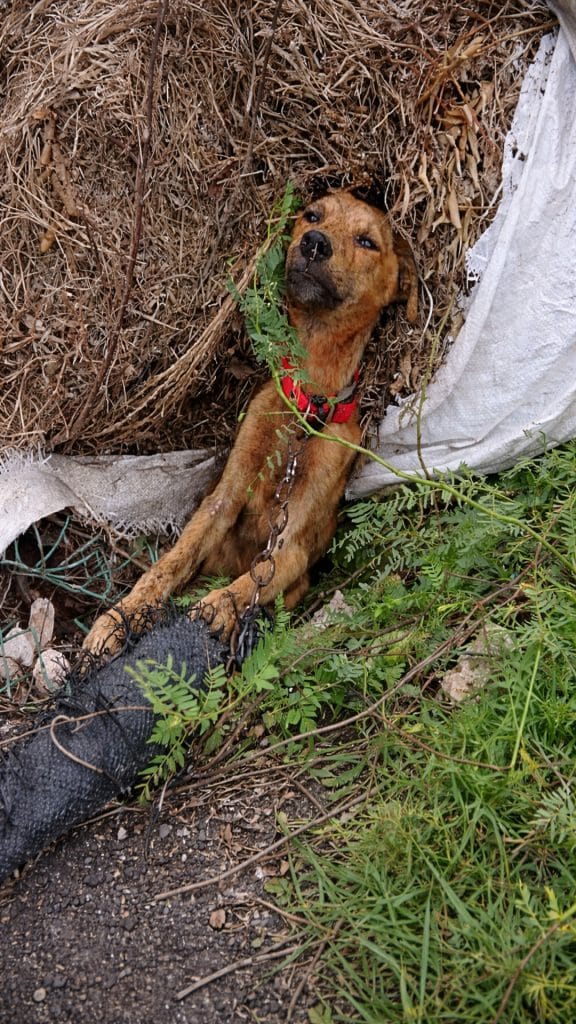 When Alex was first found, he was barely holding on. His small body showed clear signs of long-term neglect, and he was weak from hunger, thirst, and exhaustion. He lay quietly near the roadside, attached to a worn collar that kept him from wandering to safety. Blending into the dusty surroundings, Alex had become almost invisible to the world passing by. For days—perhaps longer—cars and people moved around him without realizing how desperately he needed help.