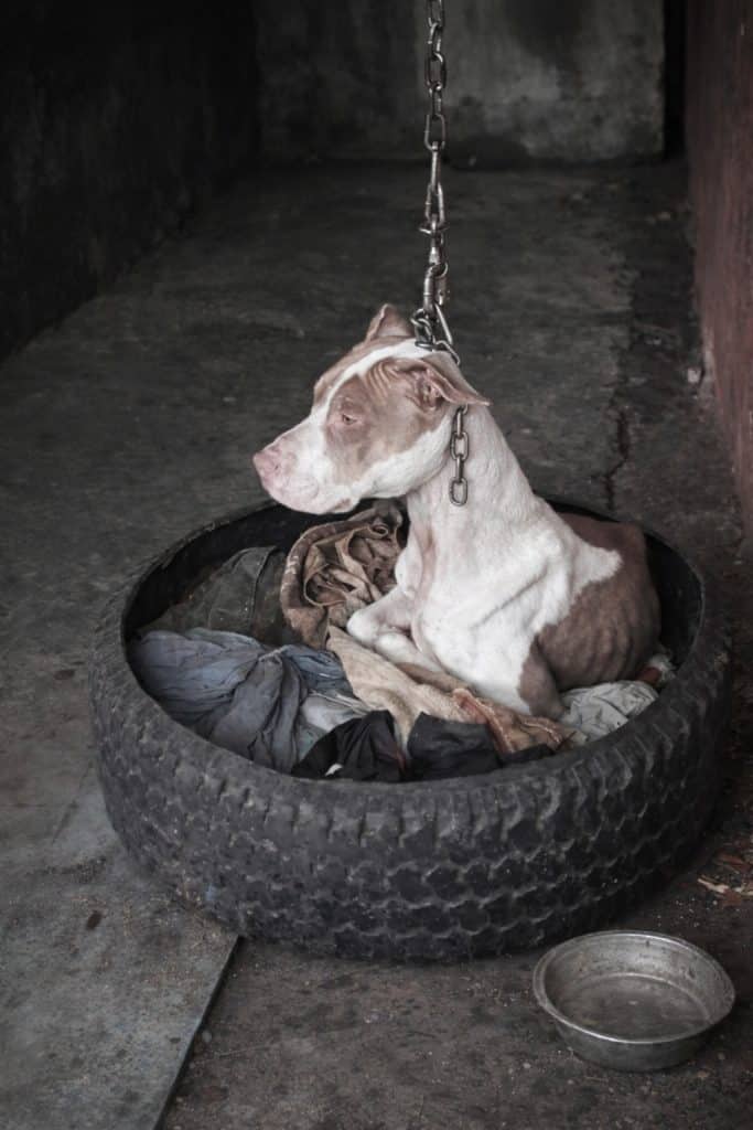 Eventually, Cala became so weak that standing was no longer an option. She spent her days sitting in one place, leaning against an old car tire. Around her neck was a short, unforgiving chain attached to a post. The chain was so tight and so short that she could not lower her head to rest. Even the simple comfort of laying her head down was taken from her.