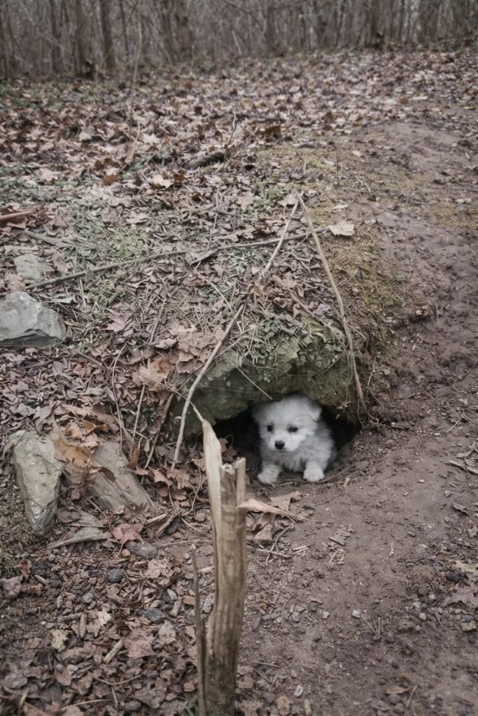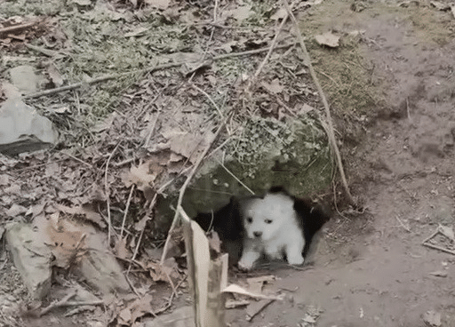 Curled together in the shadows were seven tiny puppies. They were barely old enough to explore, their eyes wide with curiosity and uncertainty. Some huddled close to one another for warmth, while others cautiously peered out from behind their siblings. The cave offered minimal protection from the elements, and it was clear the mother had been doing everything she could to keep them safe with very limited resources.