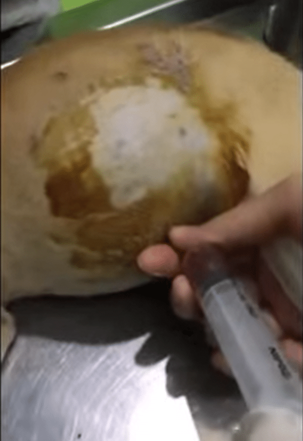 Right there in the clinic, the veterinarians began treatment. Using specialized equipment, they slowly started draining the fluid. It was a careful process that required patience and precision. His body was weak, and sudden changes could have been dangerous.
