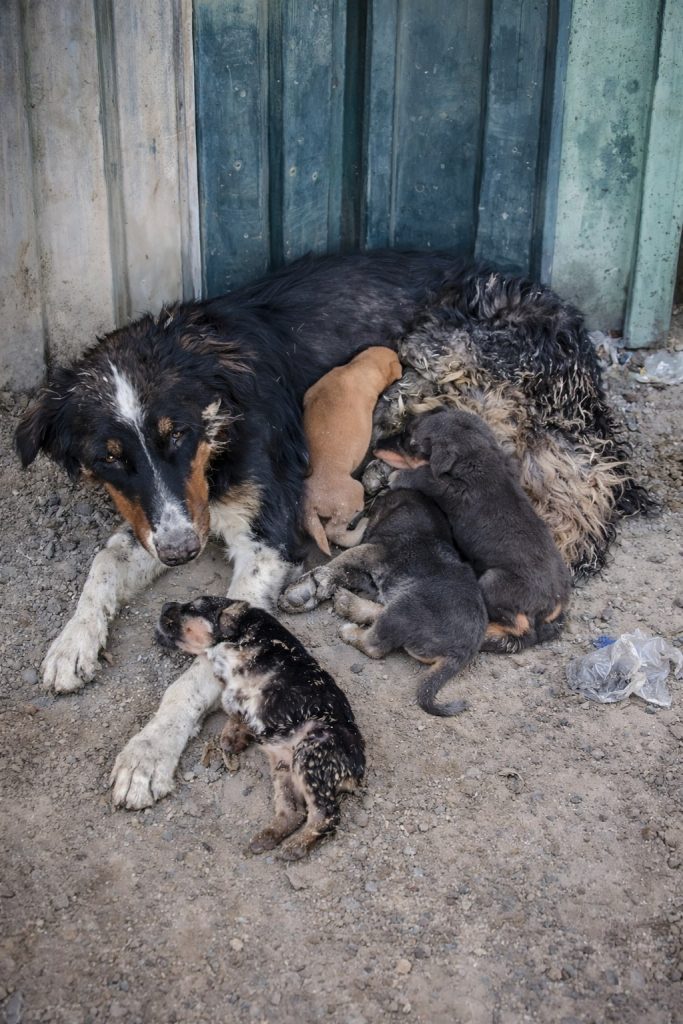 Her shaking wasn’t just from the cold pavement beneath her. It was the result of hunger, dehydration, and days—perhaps weeks—of uncertainty. Nursing had drained what little strength she had left. The puppies nuzzled closer, their tiny mouths searching for milk that her body was struggling to provide. Their soft cries blended with the sounds of traffic, easily overlooked by anyone not paying attention.