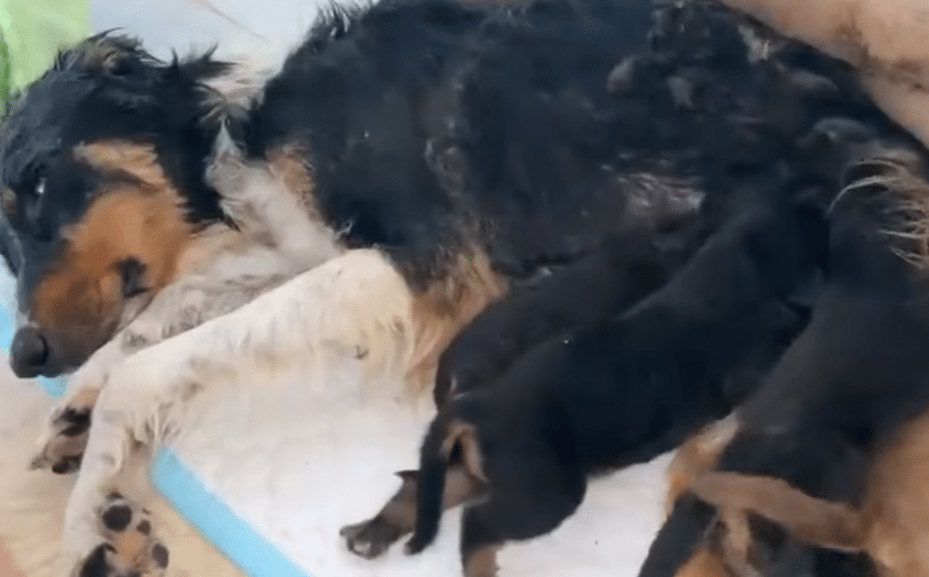 The woman approached slowly, speaking in a gentle voice, careful not to startle her. The mother dog lifted her head, unsure, her body tensing as if preparing to defend her babies with the last of her strength. But she didn’t growl or retreat. Instead, she watched closely, as though weighing whether this stranger was danger or hope.