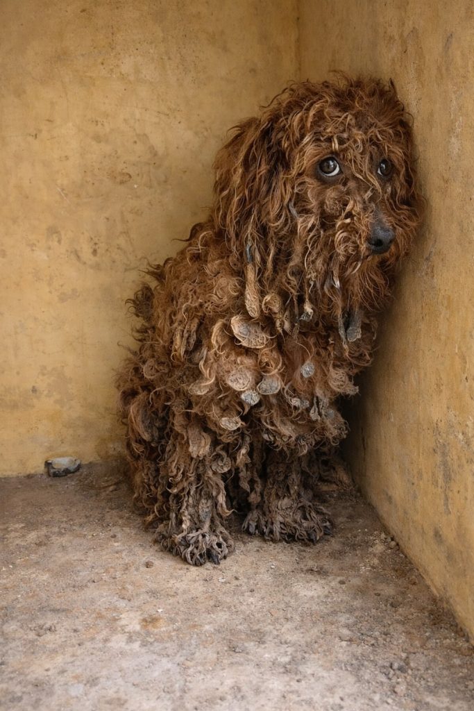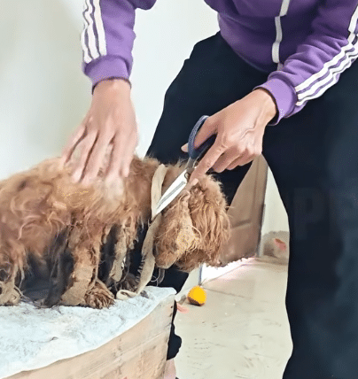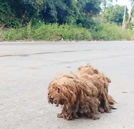 She was small, painfully thin, and almost indistinguishable from the muddy ground around her. Her once reddish-brown fur hung in tangled clumps, weighed down by dirt and rain. Her body trembled, not just from the cold, but from exhaustion that had clearly built up over a long, lonely stretch of survival. Her eyes told the rest of the story. They were wide, cautious, and far too old for such a young dog. They carried the kind of fear that comes from too many nights spent alone with no safety and no certainty of tomorrow.