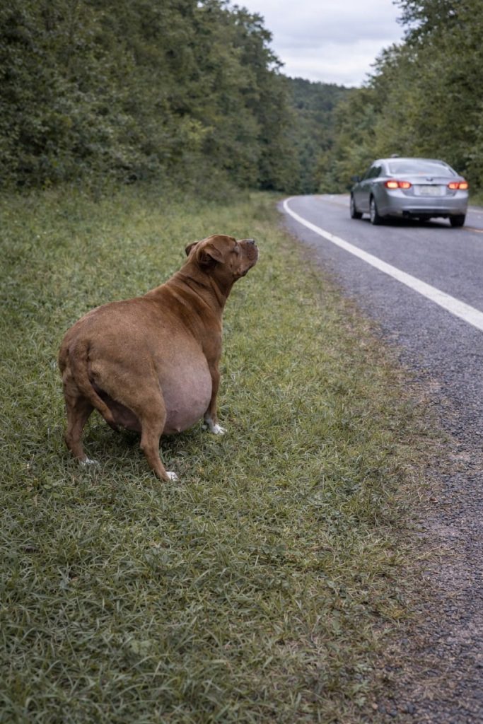 She was just another shadow along the roadside—easy to miss if you weren’t looking closely. A stray mother dog, alone and heavily pregnant, moving slowly with a belly so swollen it brushed the ground beneath her. Every step looked painful. Every pause felt uncertain. She lingered near the road, watching cars pass by as if one of them might carry an answer, or at least a moment of mercy.
