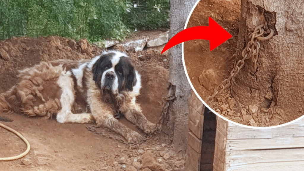 For eight long years, she lived tethered to a single tree in a forgotten backyard. Through freezing winters and scorching summers, a heavy iron chain circled her neck, its weight growing heavier with each passing season. The ground beneath her rarely changed—rain turned the soil into thick mud, summer heat baked it dry until cracks spread like scars. She had no warm shelter, no shade from the sun, and no comfort beyond the instinct to survive.