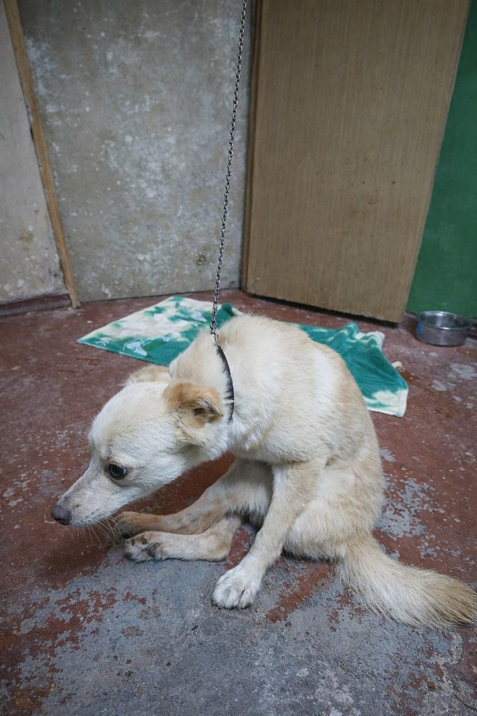 Lusya’s story begins in a place no animal should ever know, marked by loneliness, fear, and quiet suffering. When she was first discovered, she was barely recognizable as the gentle dog she would later become. Left behind in an isolated area, restrained and forgotten, Lusya had endured a long period of neglect that weakened both her body and her spirit. Time had passed slowly for her, each day blending into the next, with no comfort, no reassurance, and no sign that help was coming. Yet even in that silence, a small spark of life remained inside her.