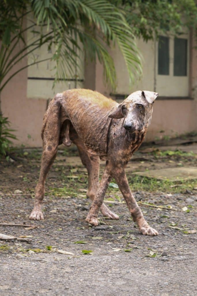 When Natu was first found, the signs of prolonged suffering were impossible to ignore. He wandered through a barren area with little access to food or shelter, his body showing the toll of months—perhaps longer—of neglect. Severe mange had overtaken his skin, leaving him weak, uncomfortable, and vulnerable to infection. His once-protective coat was thin and uneven, and his movements reflected both hunger and exhaustion. It was clear that survival itself had become a daily struggle.