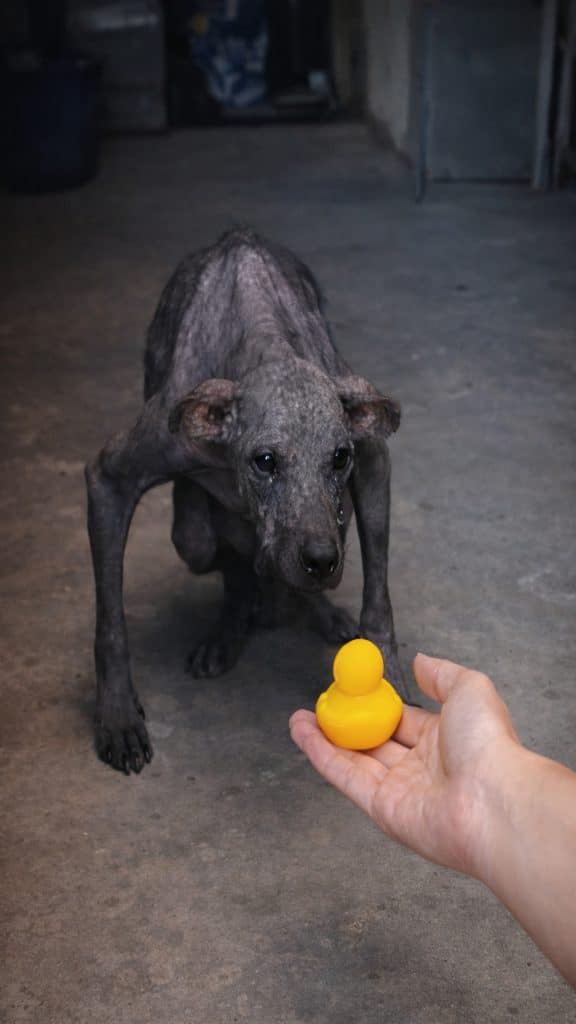 Emily’s dedication extended beyond feeding. She gently washed Batty, cleaning his matted fur and soothing the scars that told the story of his past abandonment. Every touch, every word of reassurance built trust, gradually replacing fear with comfort. Batty began wagging his tail, leaning into Emily’s presence, and responding to the love she offered so freely.